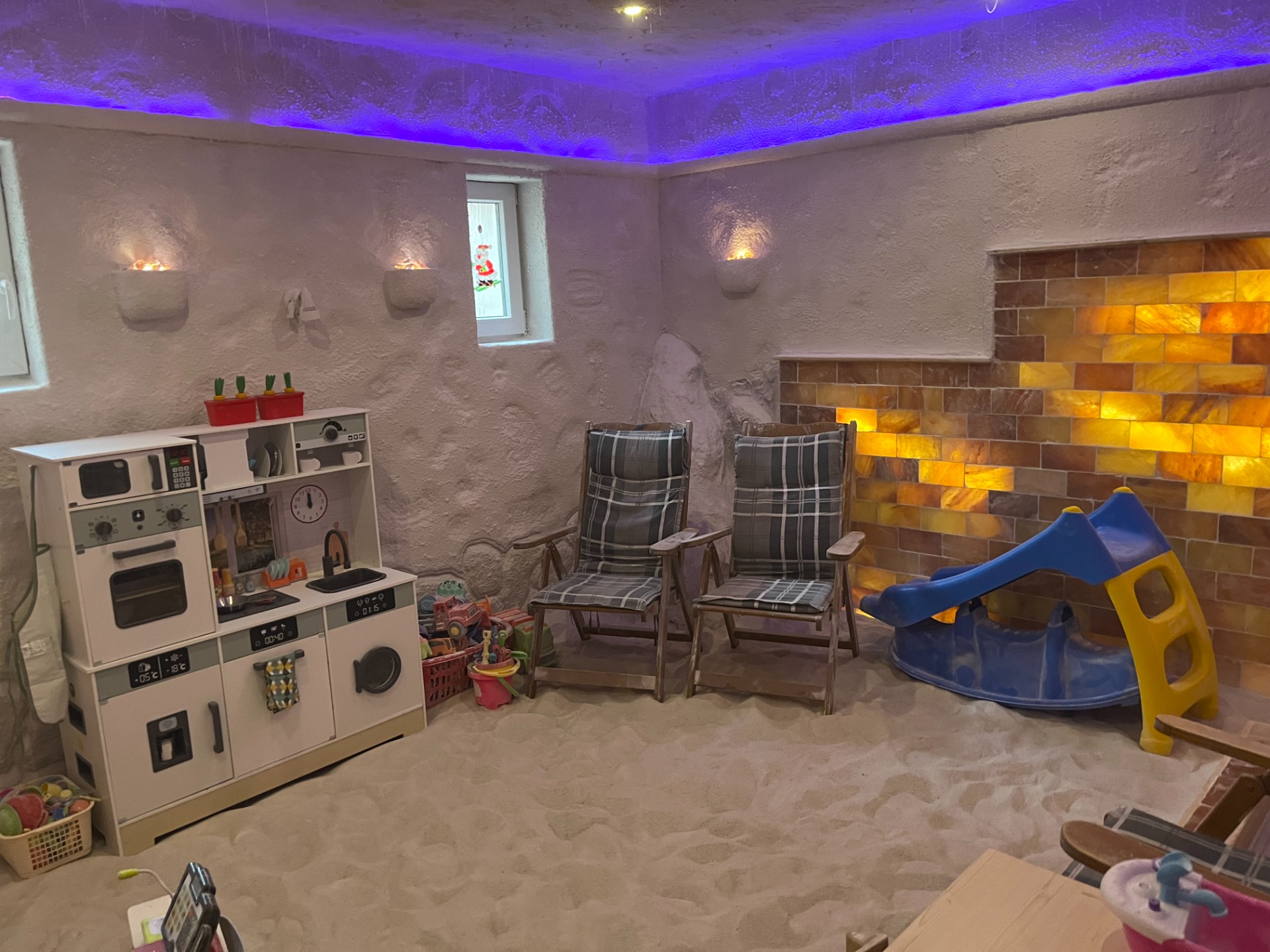 "Csúszdás" sószobánkban 16 m2-es sóhomokozó és összességében 4,5 tonna himalájiai és parajdi kősó található! Ez a sószobánk a nagyobb, max. 6 személy részére ajánlott, 4 felnőttnek behelyezett pihenőszékkel!